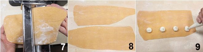 Rollen Sie den Teig mit Hilfe einer Nudelmaschine aus 7, beginnend mit der dicksten Einstellung, falten und drehen Sie ihn bei jedem Durchgang, bis zur dünnsten Einstellung 8. Gleichen Sie die Teigbahnen aus und spritzen Sie kleine Häufchen der Füllung auf eine Seite der Teigbahn 9.