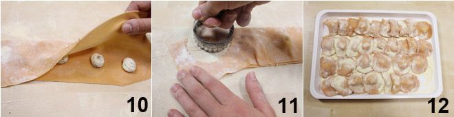 Befeuchten Sie mit einem Pinsel die Ränder mit Wasser, damit der Teig gut haftet und die Ravioli beim Kochen nicht aufgehen. Falten Sie den Teig und drücken Sie leicht, damit die beiden Teigbahnen perfekt haften 10. Mit einem Ausstecher geben Sie Ihren roten Ravioli mit Tomate die Form eines Halbmondes 11 und legen Sie sie auf ein Tablett, das mit Hartweizengrieß bestreut ist 12. Wenn Sie sie lieber rund machen möchten, überlappen Sie die Teigbahnen und schneiden Sie mit einem Ausstecher.