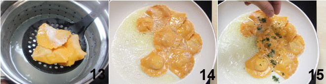 Kochen Sie die Ravioli in gesalzenem, kochendem Wasser, lassen Sie sie abtropfen und schwenken Sie sie in einer Pfanne, in der Sie ein Stück Butter geschmolzen haben (13-14). Bestreuen Sie sie mit gehackten Kräutern und einer Prise schwarzem Pfeffer und servieren Sie sie heiß 15.