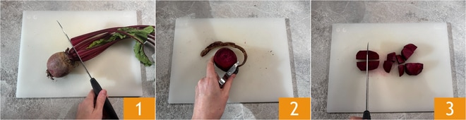 Um die Ravioli mit Roter Bete zuzubereiten, beginnen Sie mit der Füllung: Trennen Sie die Bete von den Blättern 1, die Sie später für das Dressing verwenden werden. Schälen Sie die Bete 2 und schneiden Sie sie in etwa 1,5 cm große Würfel 3; Sie sollten etwa 200 g sauberes Fruchtfleisch erhalten.