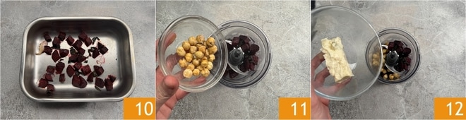 Wenn die Rote Bete gut geröstet ist, entfernen Sie den Knoblauch 10 und geben Sie sie in ein Mixer, dann fügen Sie Haselnüsse 11 und Gorgonzola 12 hinzu und pürieren Sie gründlich.