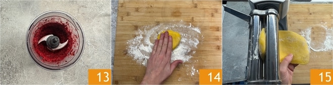 Sie sollten ein gleichmäßiges Püree erhalten 13, dann geben Sie es in einen Spritzbeutel ohne Tülle und stellen Sie es im Kühlschrank beiseite. Nun nehmen Sie den Teig und stückeln ihn portionsweise, wobei Sie den verbleibenden Teil gut abgedeckt halten, um ein Austrocknen zu verhindern. Mehlen und drücken Sie den Teig leicht flach 14, dann führen Sie ihn durch die Nudelmaschine, beginnend mit der dicksten Einstellung 15.