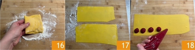 Falten Sie den Teig, um die Form zu regulieren 16, dann lassen Sie ihn erneut durch die erste Einstellung und fahren Sie fort, die Dicke schrittweise zu verringern, bis Sie die vorletzte erreichen. Sie sollten Teigblätter mit einer Dicke von etwa 2 mm erhalten 17. Pressen Sie kleine Häufchen der Füllung auf die untere Hälfte eines Teigblattes und lassen Sie genügend Abstand zwischen ihnen 18.