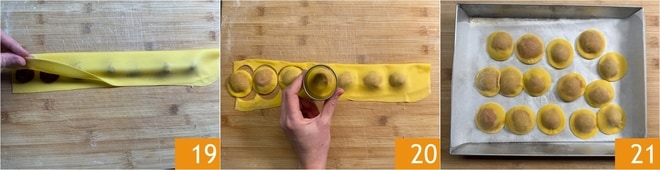 Falten Sie die obere Hälfte, um die Häufchen zu bedecken 19 und drücken Sie den Teig gut um die Füllung, um ihn perfekt haften zu lassen und die Luftblasen herauszudrücken. Schneiden Sie runde Ravioli mit einem 6,5 cm Durchmesser Ausstecher 20 und fahren Sie fort, bis Sie alle Zutaten aufgebraucht haben. Sie können die Reste erneut kneten und nach kurzem Ruhen des Teigs erneut ausrollen. Legen Sie die Ravioli während der Herstellung auf ein mit Backpapier ausgelegtes Tablett 21.