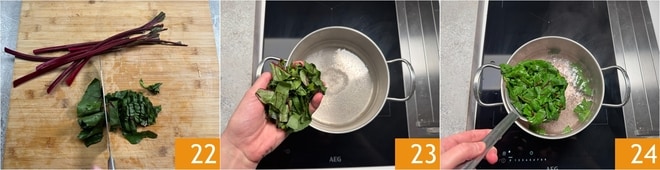 Kümmern Sie sich um das Dressing: Nehmen Sie die beiseite gelegten Bete-Blätter und trennen Sie die Stiele. Schneiden Sie die Blätter grob 22, lassen Sie einige ganze für das Anrichten. Blanchieren Sie die geschnittenen Blätter eine Minute lang in kochendem Salzwasser 23. Abtropfen lassen 24 und das Kochwasser aufbewahren, das Sie zum Kochen der Ravioli benötigen.
