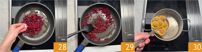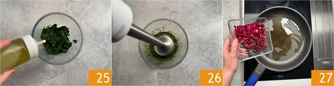 Geben Sie die Blätter in eine Schüssel, fügen Sie einen Schuss Olivenöl hinzu 25 und pürieren Sie mit dem Stabmixer, um ein Püree zu erhalten 26. In einer separaten Pfanne erhitzen Sie einen Schuss Öl und fügen die in Stücke geschnittenen Bete-Stängel hinzu 27.