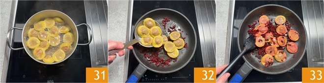 Salzen 28 und bei starker Hitze 3-4 Minuten sautieren 29. Geben Sie die Ravioli in dasselbe Wasser, in dem Sie die Blätter gekocht haben 30, nachdem Sie es erneut zum Kochen gebracht haben.