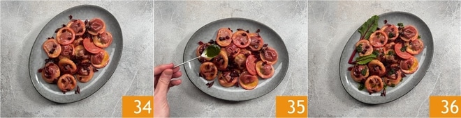 Richten Sie die Ravioli mit Roter Bete an 34 und vervollständigen Sie sie mit ein paar Tropfen des Blattöls 35, etwas frisch gemahlenem Pfeffer und ein paar der zur Seite gelegten Blätter. Ihre Ravioli mit Roter Bete sind bereit zum Servieren 36!