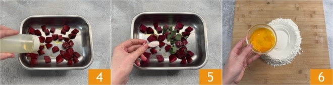 Geben Sie die Rote Bete in eine Backform und würzen Sie sie mit Öl 4, reichlich von Hand geschnittener Salbei, Salz 5 und einer Knoblauchzehe. Backen Sie in einem auf 200°C vorgeheizten statischen Ofen etwa 35 Minuten. In der Zwischenzeit kümmern Sie sich um die frische Pasta: Geben Sie das Mehl auf das Nudelbrett, formen Sie eine Vertiefung in der Mitte und geben Sie die Eier hinein 6.
