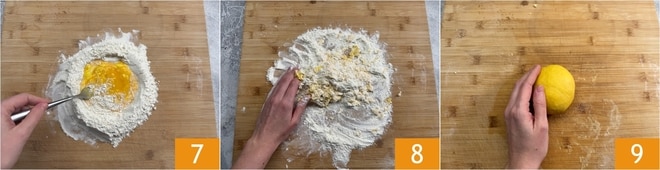 Beginnen Sie, die Eier mit einer Gabel 7 in das Mehl zu integrieren, dann weiter von Hand 8, indem Sie den Teig mindestens 10 Minuten lang kneten. Wenn er glatt und kompakt ist 9, decken Sie ihn mit Folie ab und lassen Sie ihn eine halbe Stunde bei Raumtemperatur ruhen.