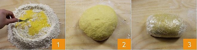 Um die Ravioli del plin zuzubereiten, bereiten Sie zuerst den Eiernudelteig nach den Anweisungen, die Sie Frische Eiernudeln (Teig und Formate) finden. Geben Sie das Mehl auf die Arbeitsfläche und brechen Sie nacheinander die Eier in die Mulde 1. Von innen beginnend, mischen Sie die Eier mit einem Löffel; arbeiten Sie dann mit den Händen oder einer Gabel den Teig, indem Sie das gesamte Mehl auf der Arbeitsfläche einarbeiten. Sollte der Teig das Mehl nicht vollständig aufnehmen oder etwas hart sein, fügen Sie ein oder zwei Esslöffel lauwarmes Wasser hinzu und kneten Sie weiter, bis er glatt und kompakt ist 2. Decken Sie den Teig gut mit Frischhaltefolie ab 3 und lassen Sie ihn an einem kühlen, trockenen Ort eine Stunde ruhen.