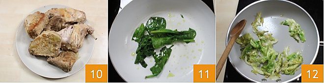 Wenn das Fleisch gar ist, nehmen Sie es heraus und lassen Sie es abkühlen 10. Bewahren Sie das Gemüse mit dem Bratenfond auf, der zum Würzen der Ravioli verwendet wird. In der Zwischenzeit braten Sie den Spinat 11 und den Endivien 12 jeweils in einer Pfanne mit etwas Öl an, bis sie zusammengefallen sind (das dauert etwa 5 Minuten). Wenn Sie möchten, können Sie den Spinat und den Endivien auch in einer einzigen Pfanne zubereiten, achten Sie darauf, zuerst den Endivien für ein paar Minuten zu garen und dann den Spinat hinzuzufügen, der weniger Zeit benötigt.
