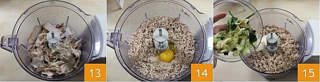 Entbeinen Sie in der Zwischenzeit das Kaninchen und schneiden Sie die Schweinelende und das Kalbsfleisch in Stücke, geben Sie das gesamte Fleisch in einen Mixer 13, zerkleinern Sie es, fügen Sie dann das Ei 14, das Gemüse 15 und den Käse hinzu. Würzen Sie mit Salz und Pfeffer und fügen Sie, falls nötig, etwas Brühe hinzu.