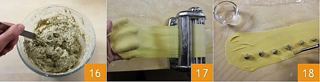 Mixen Sie alle Zutaten, bis Sie eine sehr dichte und kompakte Füllung erhalten 16. Jetzt bereiten Sie die Ravioli del plin zu: Nehmen Sie eine Portion Teig (achten Sie darauf, den restlichen Teig in Frischhaltefolie zu wickeln, damit er nicht austrocknet) und rollen Sie ihn dünn aus 17, Sie können das RezeptWie man den Teig ausrollt in unserer Kochschule konsultieren. Legen Sie auf die Hälfte des unteren Teigs eine Kugel Füllung von etwa 20 g und lassen Sie jeweils einen Abstand von 1-2 cm zwischen ihnen 18. Es ist wichtig, den Teig schnell zu bearbeiten, um zu verhindern, dass er hart wird.