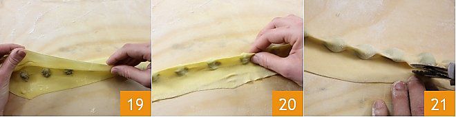 Falten Sie den Teig über sich selbst 19 entlang der Länge und kneifen Sie mit den Fingern die Teigränder an den Seiten der Füllungskugeln 20. Schneiden Sie mit einem Teigrad den Teig entlang der Länge ein paar Millimeter von der Füllung entfernt ab 21.