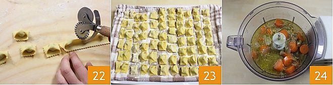 und trennen Sie dann die Ravioli 22 (sie sollten etwa 2 cm lang sein), um ihnen eine rechteckige Form zu geben. Legen Sie die Ravioli del plin auf ein Tablett mit einem mit Mehl bestäubten Tuch 23. Nehmen Sie nun das zuvor geschmorte Gemüse, geben Sie es in einen Mixer 24