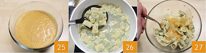 und pürieren Sie es, bis Sie eine glatte und homogene Sauce erhalten 25. Kochen Sie die Ravioli del plin in reichlich gesalzenem Wasser 26 für ein paar Minuten, sobald sie an die Oberfläche steigen, nehmen Sie sie heraus und würzen Sie sie mit der aus dem Bratenfond der Fleischsorten erhaltenen Sauce 27. Ihre Ravioli del plin sind bereit, serviert zu werden!