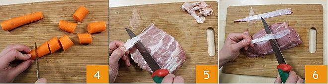 Schneiden Sie die Karotten grob 4, den Sellerie, die Zwiebel und legen Sie sie beiseite. Entfernen Sie das Fett von der Schweinelende 5 und dem Kalbsfleisch 6, alternativ können Sie den Metzger bitten, das Fleisch zu säubern und das Fett zu entfernen.