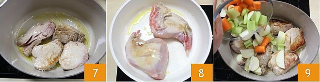 Erhitzen Sie in einem großen Topf einige Esslöffel Öl und braten Sie die Schweinelende und das Kalbsfleisch 7 an, bis sie gut gebräunt sind. In einer anderen Pfanne braten Sie auch die Kaninchenkeulen mit zwei Esslöffeln Öl 8 an. Wenn sie gut angebraten sind, geben Sie alle Fleischsorten in einen einzigen Topf und fügen Sie die Karotten, den Sellerie und die Zwiebel hinzu 9. Salzen, pfeffern und fügen Sie eine Kelle Brühe oder Wasser hinzu (für die Zubereitung der Brühe können Sie das Rezept Gemüsebrühe in der Kochschule konsultieren), decken Sie den Topf ab und lassen Sie alles etwa eine Stunde kochen. Falls nötig, fügen Sie während des Kochens Brühe oder Wasser hinzu.
