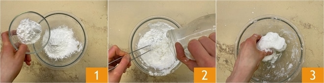 Um die Kristallravioli zuzubereiten, beginnen Sie mit dem Teig: Geben Sie die Weizenstärke und die Maisstärke in eine Schüssel 1. Mischen Sie die Pulver mit Stäbchen (oder einem Löffel), dann gießen Sie das kochende Wasser langsam hinzu 2. Sobald das gesamte Wasser aufgenommen ist, kneten Sie den Teig von Hand 3.