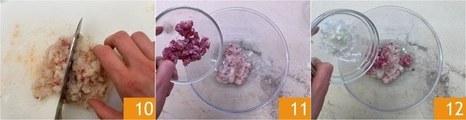 Sie sollten eine sehr feine Hackmasse erhalten 10. Geben Sie die Garnelen in eine Schüssel, fügen Sie dann das Schweinehackfleisch 11 und eine halbe gehackte Frühlingszwiebel hinzu 12.