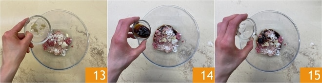 Würzen Sie nun mit geriebenem Ingwer 13, Sojasauce, Austernsauce 14 und Sesamöl 15.