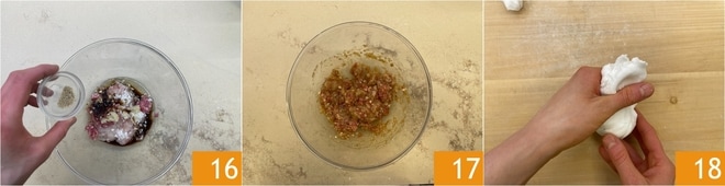Fügen Sie auch frisch gemahlenen weißen Pfeffer 16 und eine Prise Salz hinzu. Mischen Sie gut, um die Füllung zu vermischen 17. Nun nehmen Sie den Teig wieder auf, um die Ravioli zu formen: Nehmen Sie Stücke von etwa 20 g für jede Ravioli 18. Decken Sie den Rest des Teigs mit Frischhaltefolie ab, um ein Austrocknen zu verhindern.