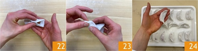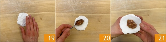Rollen Sie die Teigkugel aus, indem Sie leichten Druck mit der Seite der Handfläche ausüben: Die Scheibe sollte am Rand dünner sein, damit der dickere Mittelteil beim Kochen nicht reißt. Lösen Sie die Scheibe mit einem Teigschaber von der Arbeitsfläche und füllen Sie die Mitte mit einem Teelöffel Füllung 20. Klappen Sie die Ravioli zur Hälfte zusammen, indem Sie die beiden Enden aneinanderlegen 21.