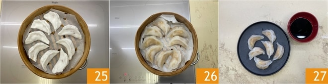 Bereiten Sie den Dampfgarer vor, legen Sie ihn mit einem Blatt Backpapier aus, das Sie mit kleinen Löchern versehen haben, und legen Sie die Ravioli darauf 25. Schließen Sie mit dem entsprechenden Deckel und kochen Sie für 8-10 Minuten 26. Servieren Sie Ihre Kristallravioli mit Sojasauce 27!