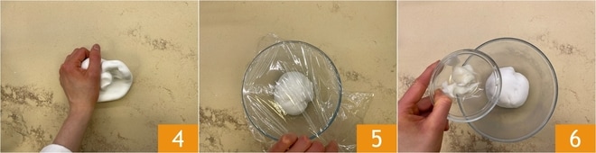 Übertragen Sie den Teig auf die Arbeitsfläche und kneten Sie weiter, bis er glatt und elastisch ist; dieser Schritt erfordert viel Energie, da der Teig ziemlich fest ist 4. Formen Sie einen Teigballen, legen Sie ihn in die Schüssel und decken Sie ihn mit Frischhaltefolie ab 5. Lassen Sie ihn 5 Minuten ruhen, dann fügen Sie das Schmalz hinzu, das dem Teig mehr Elastizität verleiht 6.