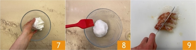 Bilden Sie erneut einen Teigballen, legen Sie ihn zurück in die Schüssel 7 und bestreichen Sie die Oberfläche mit Sesamöl, um ihn feucht zu halten 8. Decken Sie ihn mit Frischhaltefolie ab und stellen Sie ihn beiseite, während Sie sich um die Füllung kümmern. Hacken Sie die gereinigten Garnelen mit einem Messer 9.