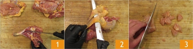 Um die Ravioli gefüllt mit Perlhuhn und Grana Padano zuzubereiten, bereiten Sie zuerst die Fleischbrühe nach Anleitung auf unserer Website zu und halten Sie sie warm, dann kümmern Sie sich um das Ragout: Entbeinen Sie das Perlhuhn 1, entfernen Sie die Haut 2 und schneiden Sie 250 g Fleisch in etwa 2 cm große Stücke 3.
