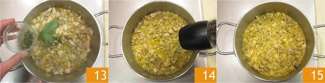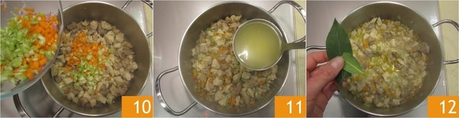 Fügen Sie das gehackte Gemüse hinzu 10 und braten Sie es ein paar Minuten an, dann geben Sie eine Kelle heiße Brühe dazu 11 und würzen Sie mit Lorbeerblättern 12.
