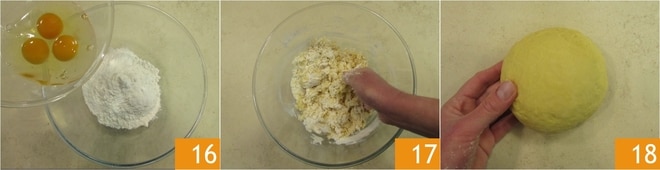 In der Zwischenzeit bereiten Sie die frische Eierpasta zu: Geben Sie das Mehl und die Eier in eine Schüssel 16 und mischen Sie den Teig mit den Händen 17, dann arbeiten Sie weiter auf der Arbeitsfläche, bis Sie einen glatten, elastischen und homogenen Teig erhalten 18. Wickeln Sie den Teig in Frischhaltefolie und lassen Sie ihn ca. 30 Minuten ruhen.
