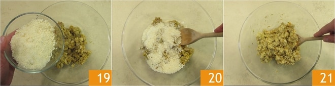 Wenn das Ragout abgekühlt ist, fügen Sie den geriebenen Grana Padano DOP hinzu 19 und mischen Sie gut, um ihn gleichmäßig zu integrieren 20, dann stellen Sie es bis zur Verwendung in den Kühlschrank 21.