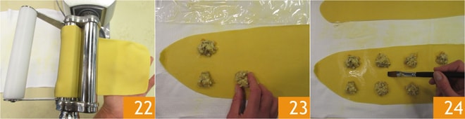 Nach der Ruhezeit der frischen Pasta verwenden Sie eine Nudelmaschine, um Teigblätter mit einer Dicke von 1-2 mm zu erhalten 22. Legen Sie die Blätter auf ein mit wenig Hartweizenmehl bestäubtes Tuch und platzieren Sie die Füllungshäufchen in einem Abstand von etwa 5 cm voneinander 23, dann befeuchten Sie die Ränder leicht mit einem Pinsel 24.