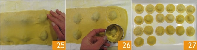 Bedecken Sie sie mit einem zweiten Teigblatt und drücken Sie die Ränder an, um sie zu versiegeln 25. Schneiden Sie schließlich die Ravioli mit einem Ausstecher mit einem Durchmesser von 6 cm aus 26 und legen Sie die entstandenen Ravioli auf ein mit Hartweizenmehl bestäubtes Tablett 27; mit diesen Mengen erhalten Sie etwa zwanzig Stück.