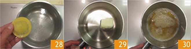 Wenn alle Ravioli fertig sind, können Sie mit dem Kochen fortfahren: Bringen Sie einen Topf mit Salzwasser zum Kochen und kochen Sie die Ravioli 3-4 Minuten lang 28. In der Zwischenzeit schmelzen Sie die Butter in einem kleinen Topf 29, bis sie eine nussbraune Farbe annimmt 30.