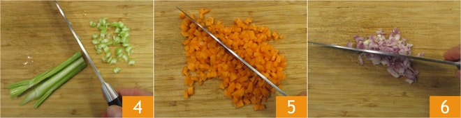 Putzen und hacken Sie den Sellerie 4, die Karotte 5 und die Schalotte 6.