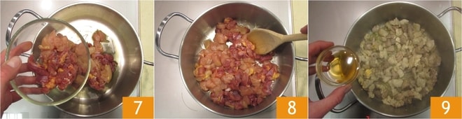 Erhitzen Sie etwas Öl in einem Topf, fügen Sie das Perlhuhn hinzu 7 und braten Sie es 5 Minuten bei hoher Hitze an, häufig umrühren 8, dann den Brandy hinzufügen 9 und verdampfen lassen.