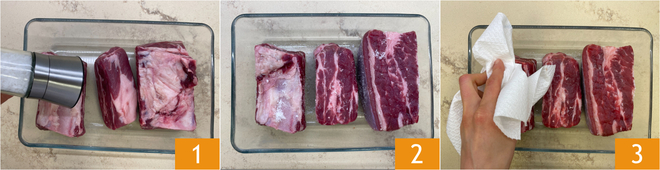 Um den Raviolo gefüllt mit Rinderrippen und Zitronenschaum zuzubereiten, beginnen Sie mit dem Fleisch für die Füllung: Bestreuen Sie die Rinderrippen von allen Seiten mit Salz 1, dann lassen Sie sie unbedeckt und bei Raumtemperatur für ein paar Stunden ruhen 2. Nach dieser Zeit tupfen Sie das Fleisch gut mit Küchenpapier ab, um es zu trocknen 3.
