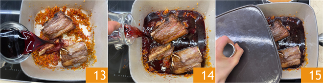 Gießen Sie nun den Rotwein 13 und den Portwein 14 dazu, pfeffern und decken Sie mit einem Deckel ab 15. Stellen Sie den Topf in den vorgeheizten statischen Ofen bei 160°C und garen Sie ihn mindestens 2 Stunden und 30 Minuten oder bis das Fleisch sehr zart ist.