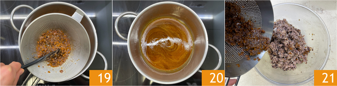 Sieben Sie den Bratfond in einen kleinen Topf 19 und lassen Sie ihn auf schwacher Flamme etwa 20 Minuten reduzieren 20 bis er auf etwa die Hälfte eingekocht ist. In der Zwischenzeit geben Sie das restliche Gemüse aus dem Sieb zum Fleisch in die Schüssel 21.