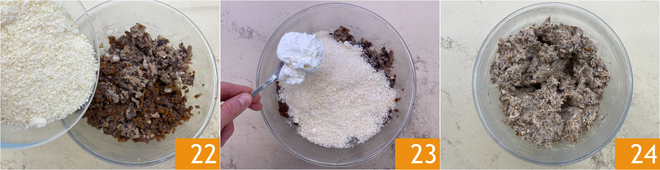 Fügen Sie den geriebenen Parmigiano Reggiano 22 und den Mascarpone 23 hinzu. Mischen Sie alles gut, um es zu vereinen 24, füllen Sie es in einen Spritzbeutel ohne Tülle und stellen Sie ihn im Kühlschrank beiseite.