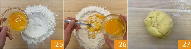 Legen Sie das Mehl auf die Arbeitsfläche und machen Sie eine Mulde, dann geben Sie die Eier 25 und die Eigelbe 26 in die Mitte. Mischen Sie das Mehl zuerst mit einer Gabel, dann arbeiten Sie weiter auf der Arbeitsfläche, bis Sie einen glatten und homogenen Teig erhalten 27. Wickeln Sie den Teig in Frischhaltefolie und lassen Sie ihn 30 Minuten bei Raumtemperatur ruhen.