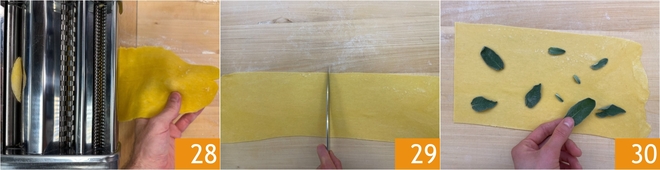 Teilen Sie den Teig in 2 Portionen und rollen Sie den ersten Teil mit einer Nudelmaschine aus 28, wobei Sie darauf achten, die zweite Portion bedeckt zu halten; Sie sollten Blätter mit einer Dicke von 1-2 mm erhalten. Schneiden Sie die Blätter in der Mitte durch und legen Sie die Salbeiblätter auf eines von ihnen 30.