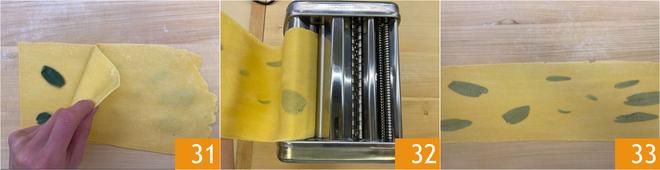 Bedecken Sie es mit der anderen Hälfte des Blattes 31 und rollen Sie alles erneut durch die Nudelmaschine 32, um sicherzustellen, dass sie gut haften: Auf diese Weise haben Sie Salbeiblätterteig erhalten 33. Rollen Sie auch die zweite Portion Teig aus, um Blätter derselben Dicke zu erhalten, aber in diesem Fall ohne Salbei: Diese werden die Basis der Ravioli.
