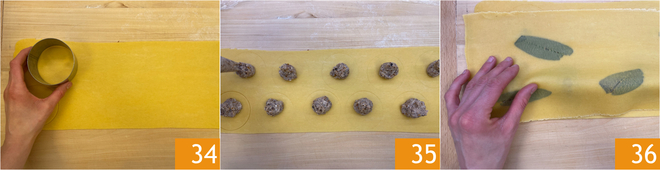 Nehmen Sie ein nicht laminiertes Teigblatt und drücken Sie leicht mit einem 7,5 cm großen Ausstecher, um den Umriss von etwa 40 Ravioli zu markieren 34. Geben Sie einen großzügigen Klecks Füllung in die Mitte jedes Kreises 35, sprühen Sie dann mit etwas Wasser und bedecken Sie es mit dem laminierten Teigblatt 36.