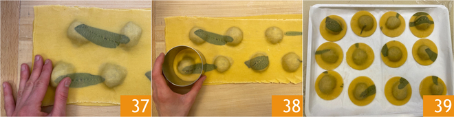 Drücken Sie gut mit den Fingern, um die gesamte Luft herauszudrücken 37; falls nötig, können Sie ein kleines Loch in die Teigplatte stechen, um die verbleibende Luft zu entfernen, und es dann wieder verschließen. Schneiden Sie schließlich die Ravioli mit dem zuvor verwendeten Ausstecher aus 38. Legen Sie die Ravioli auf ein Tablett 39 und stellen Sie sie für mindestens 2 Stunden in den Gefrierschrank; so behalten sie ihre Form besser beim Kochen.