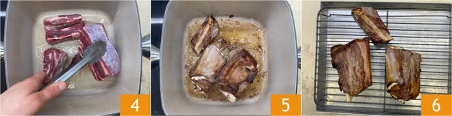 Nehmen Sie einen gusseisernen Topf und erhitzen Sie ihn gut mit einem Schuss Pflanzenöl, dann legen Sie die Rippchen hinein und bräunen Sie sie von allen Seiten an, wobei Sie sie so wenig wie möglich berühren 4. Sobald das Fleisch gut angebraten ist 5, legen Sie es auf ein Gitter 6 und lassen Sie den Bratfond im Topf.